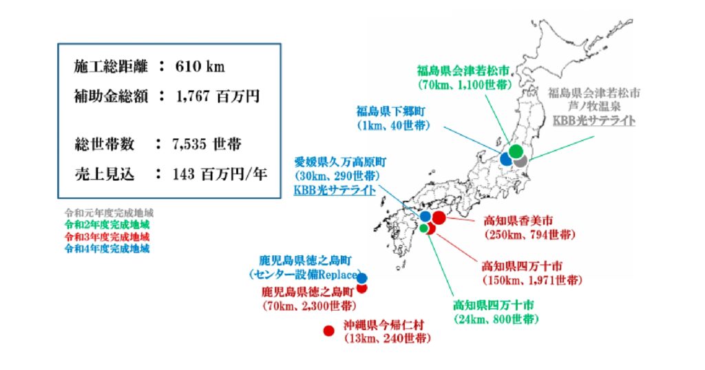 国の高度無線環境整備推進事業の一期生として会津若松市の事業完了を皮切りに、四万十市の補助事業も完了、今帰仁村、徳之島町、四万十市2期、香美市、久万高原町や下郷町、さらには徳之島町の設備リプレースまで、総額で17.6億の高度無線環境整備事業や補助事業を担ってきた。