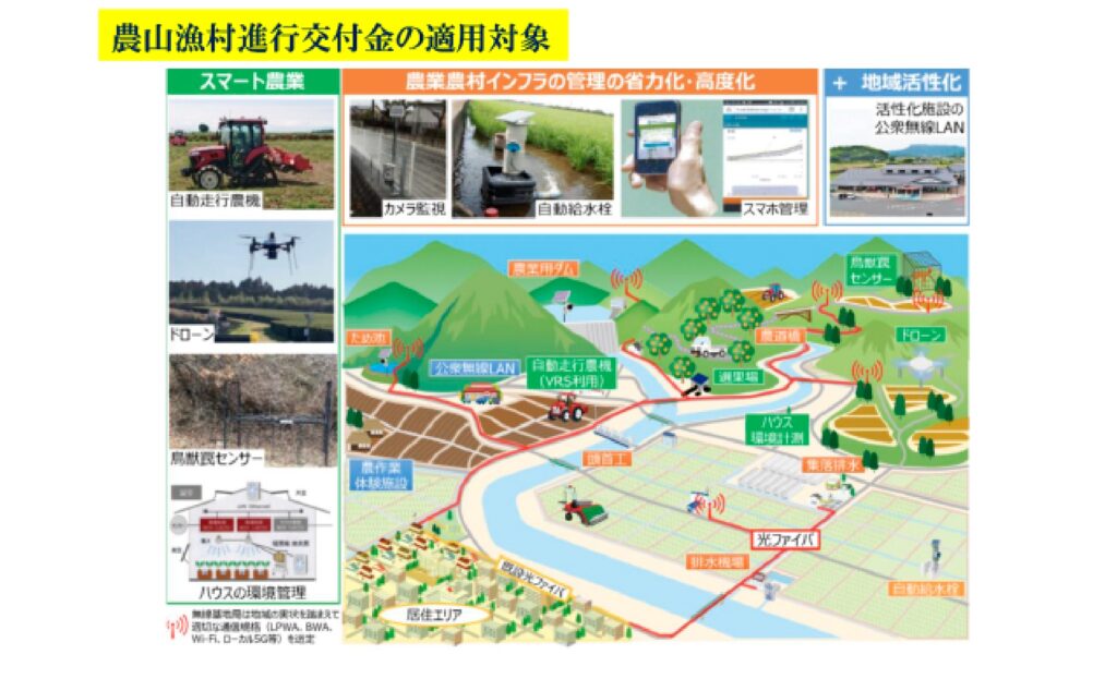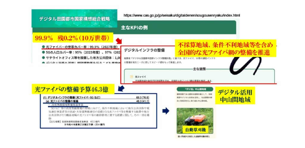 デジタル田園都市国家構想で掲げられている国のビジョンのデジ活にはスマート農業が掲げられ、農林水産省も当社が専門委員として関わっている農業農村情報通信環境整備準備会を設立して農山漁村振興交付金(情報通信環境整備対策)を創設。今後の農村地域での光ファイバ網整備には、高度無線環境整備推進事業以外の有効な交付金になり得る。