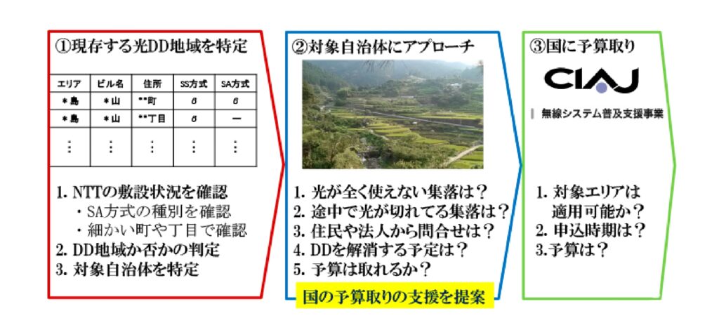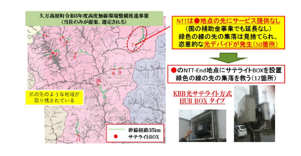 NTTが光ファイバを整備していない局舎まわりのエリア、久万高原町のような“爪の先だけ取り残されたエリア”を探索し、当社のような事業者が日本に存在すること、及び、KBB光サテライト方式や国のガイドラインにも掲載された当社独自の光ファイバ網の敷設方式を、改めて総務省や地方自治体、デジタル・デバイドでお困りの住民・企業に知らしめていく必要があります。
